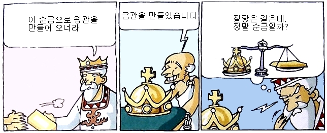 Everything in the water has buoyancy as much as the weight of the water that the object pushes. Assuming that the density of water is 1g/cm 3, the volume of the 1000g pure gold wreath will be 51.8cm3, and the buoyancy will be 51.8g. Similarly, the 30% alloy wreath volume is 64.6cm3, and the buoyancy is 64.6g. The difference in buoyancy is between 64.6 – 51.8 = 12.8g, and the difference in mass is thought to be enough to measure.