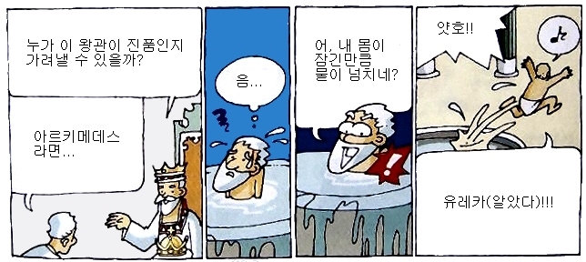 If Archimedes saw that the water flooding out of the tub, Archimedes would have figured out how to obtain the volume of irregular objects. - “I found that an object have buoyant in the water. Eureka!”