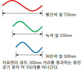 空気の密度が最も高い地表付近では、青色光が一波長の距離を通過中に、空気の分子約150個程度を過ぎていきます。